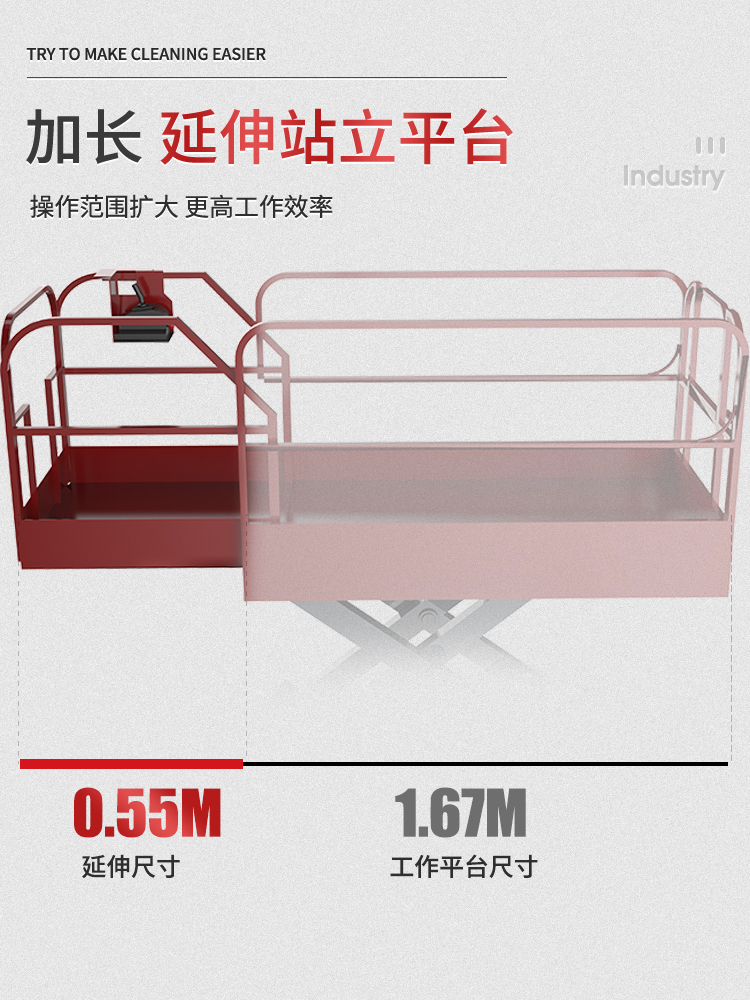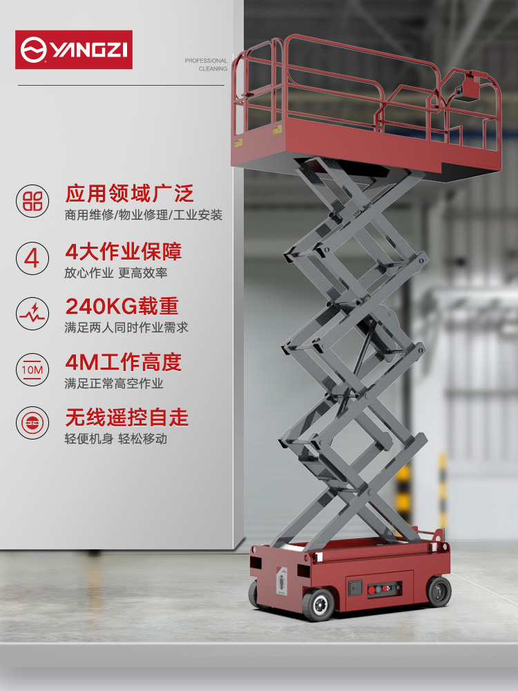 揚子升降平臺:無線自走、堅固穩定、升降平穩、移動方便、彈簧減震、安全環保等優點,還有多場景使用,加長延伸站立臺,還配有應急下降按鈕