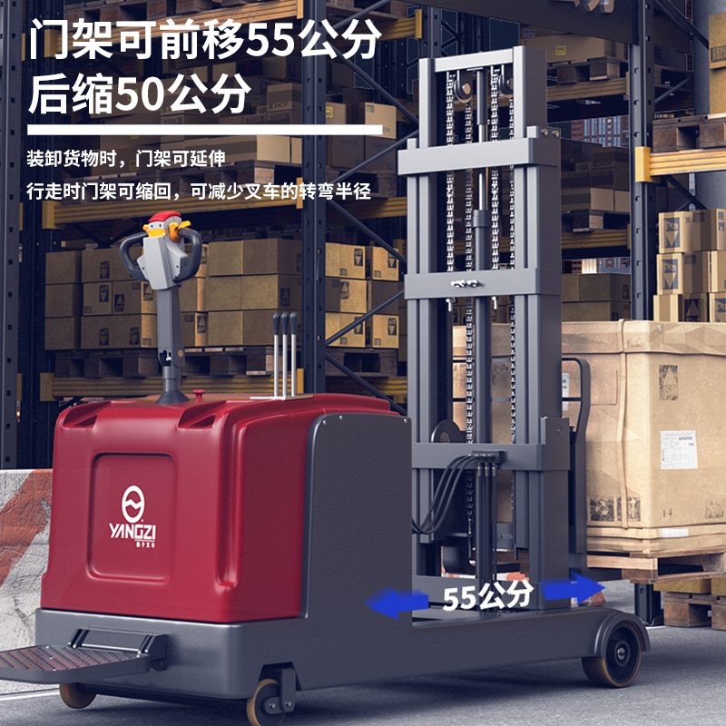 揚子推高車 CQD-J:不用條托盤的前移式電動堆高車,增強載重,通過性強,貨叉前段可緊貼地面方便叉取貨叉,而且門架后仰時貨物穩定不易滑落,使用更安全放心。